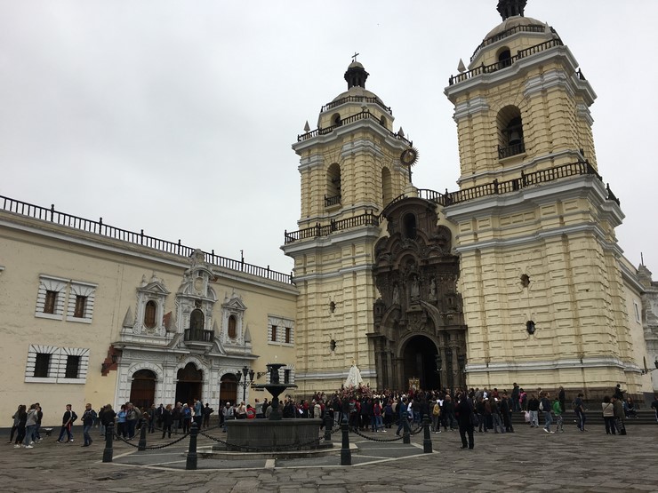 A Plaza de Armas de Lima tem vários prédios históricos e é cheio de detalhes bacanas. Ela é bem conservada e dá para ficar um tempinho ali. É uma pena que tem os famosos batedores de carteira ou, no caso, de celular. A construção que mais me chamou a atenção foi o Palácio Arquiepiscopal com sua fachada em estilo mourisco. Ver os religiosos tirando uma santa pesadíssima do convento de São Francisco e fazendo ela dançar foi peculiar. É nesse convento que estão as famosas catacumbas. Na época colonial, o lugar funcionava como um cemitério.
