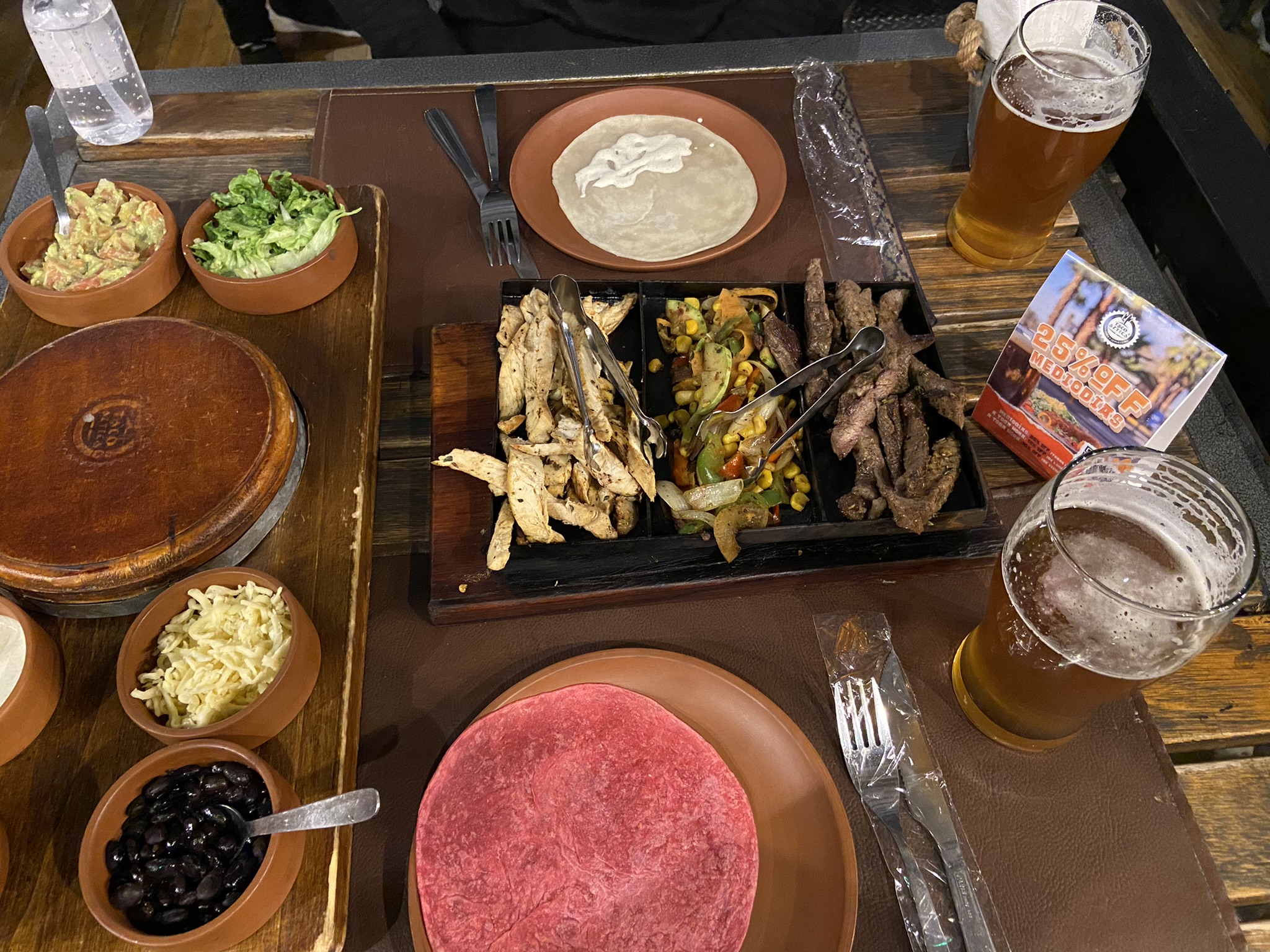Deixamos nossas bagagens no hotel (Condor Suites Apart Hotel) e caminhamos até uma rua cheia de bares e restaurantes. Ali comemos uma tortilla em um restaurante mexicano. Era boa.