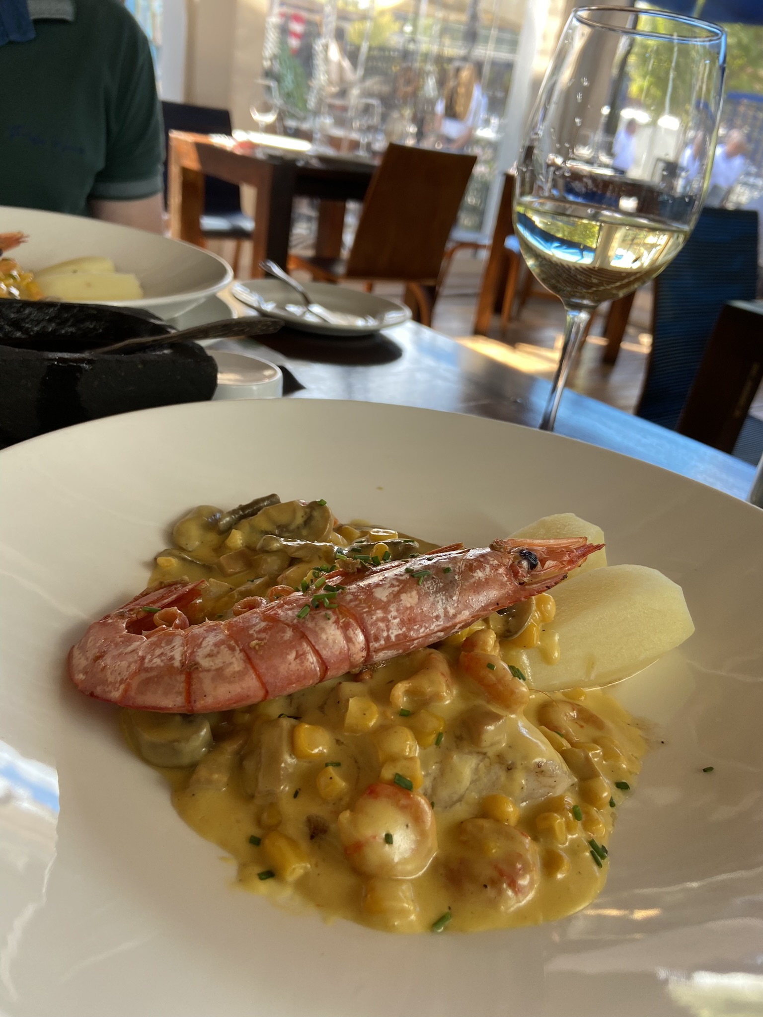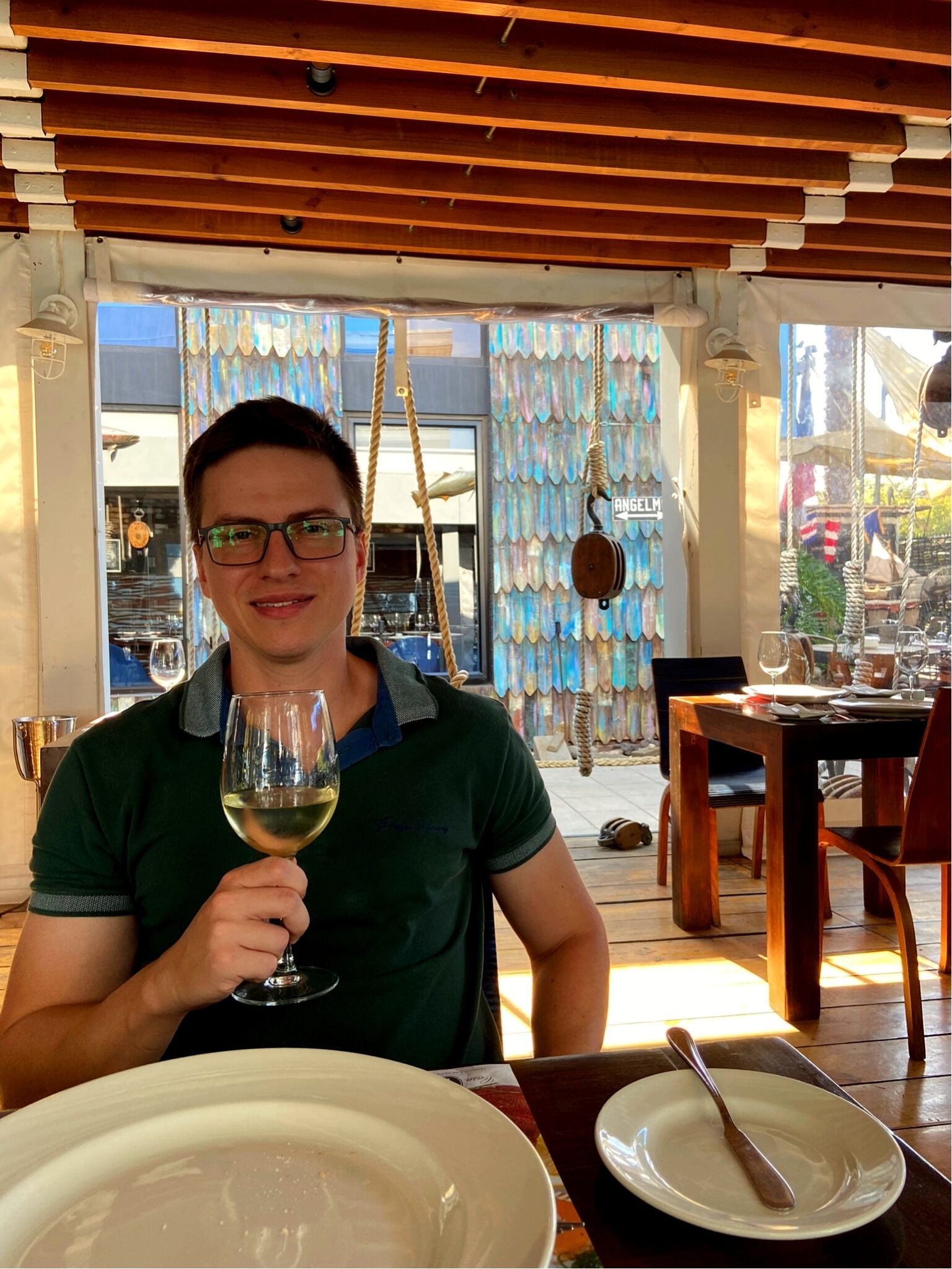 - Próxima parada: Aqui Está Coco. Esse é sem dúvidas nosso restaurante preferido em Santiago e novamente tivemos uma ótima experiência gastronômica. O forte lá são os frutos do mar. Fomos de peixe e na sequência pedimos a clássica sobremesa Torta de La Abuela. Ali já comecei o meu dia etílico degustando um Sauvignon Blanc.