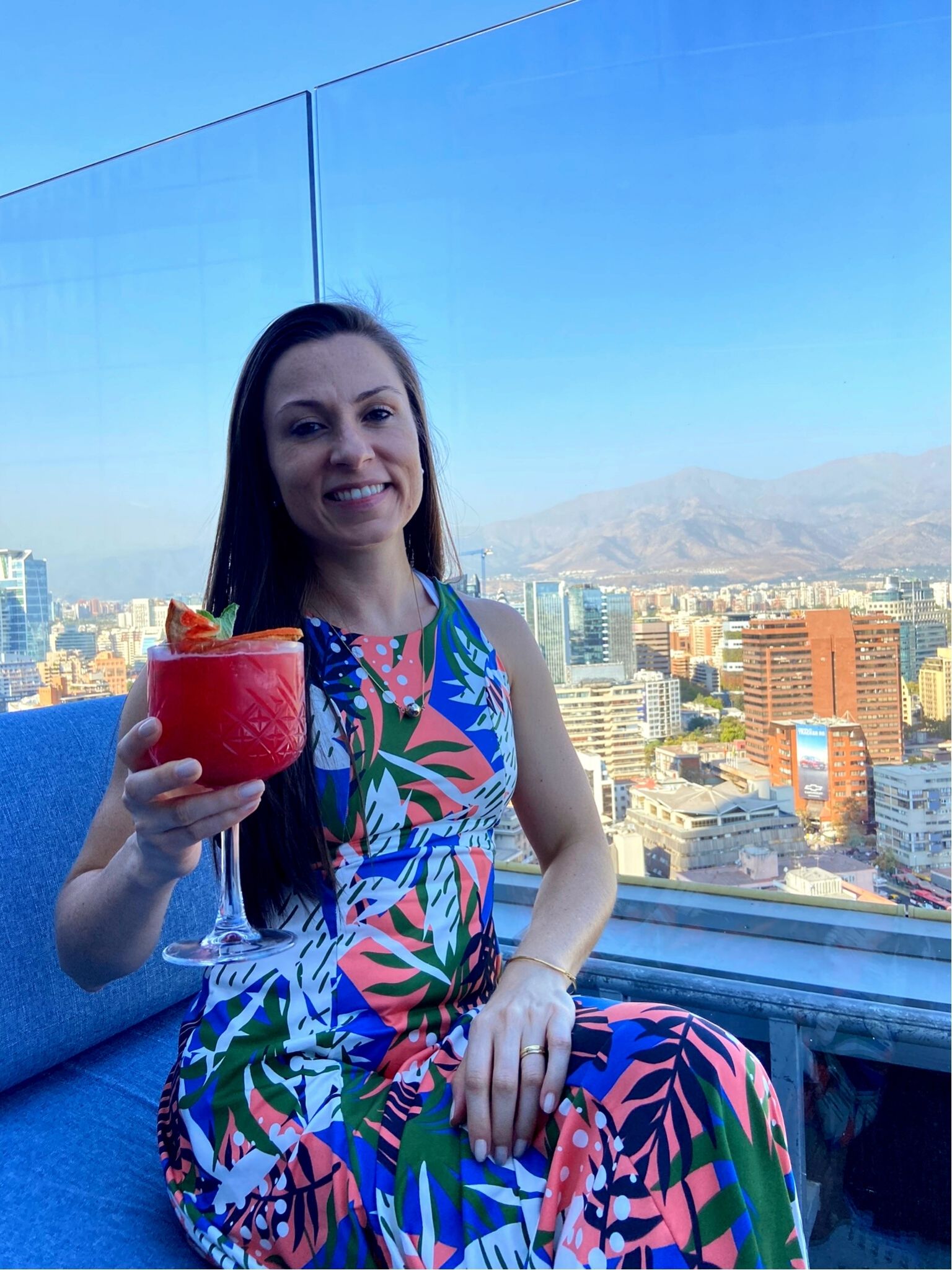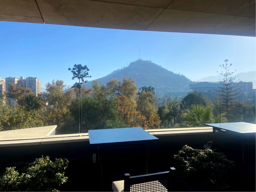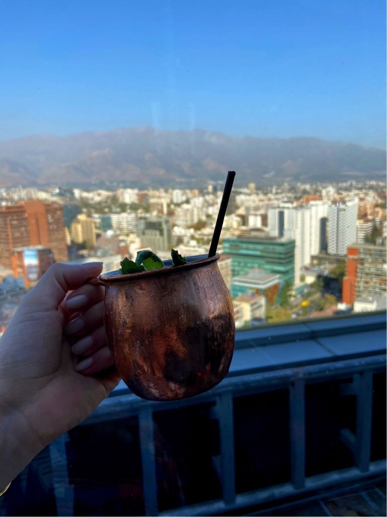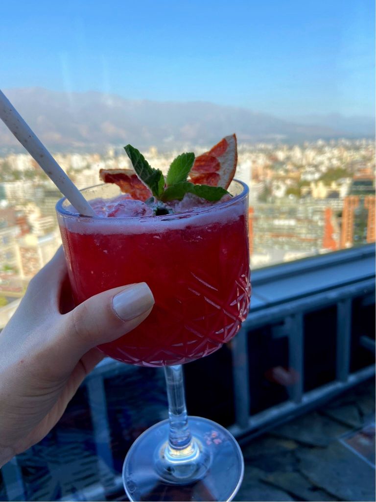 - O Luna Bar é um bar que fica no terraço de um hotel. O famoso rooftop. Ficamos em um sofá de frente (ou seria de lado?) para os Andes. Pena que não havia neve, mas a cordilheira é impressionante em qualquer condição climática. E só melhora quando saboreamos drinks enquanto a olhamos. Tomamos uns drinks elaborados e também pedi um tradicional Pisco Sour. O lugar é bem agradável e nem dá para ver o tempo passar. Só achamos que o sofá poderia estar virado de frente e que o DJ podia escolher umas músicas menos comerciais.