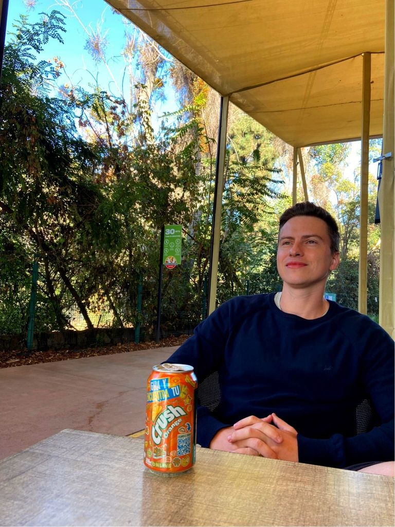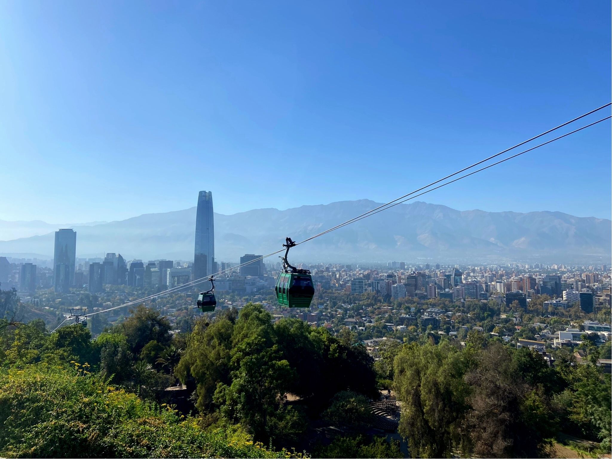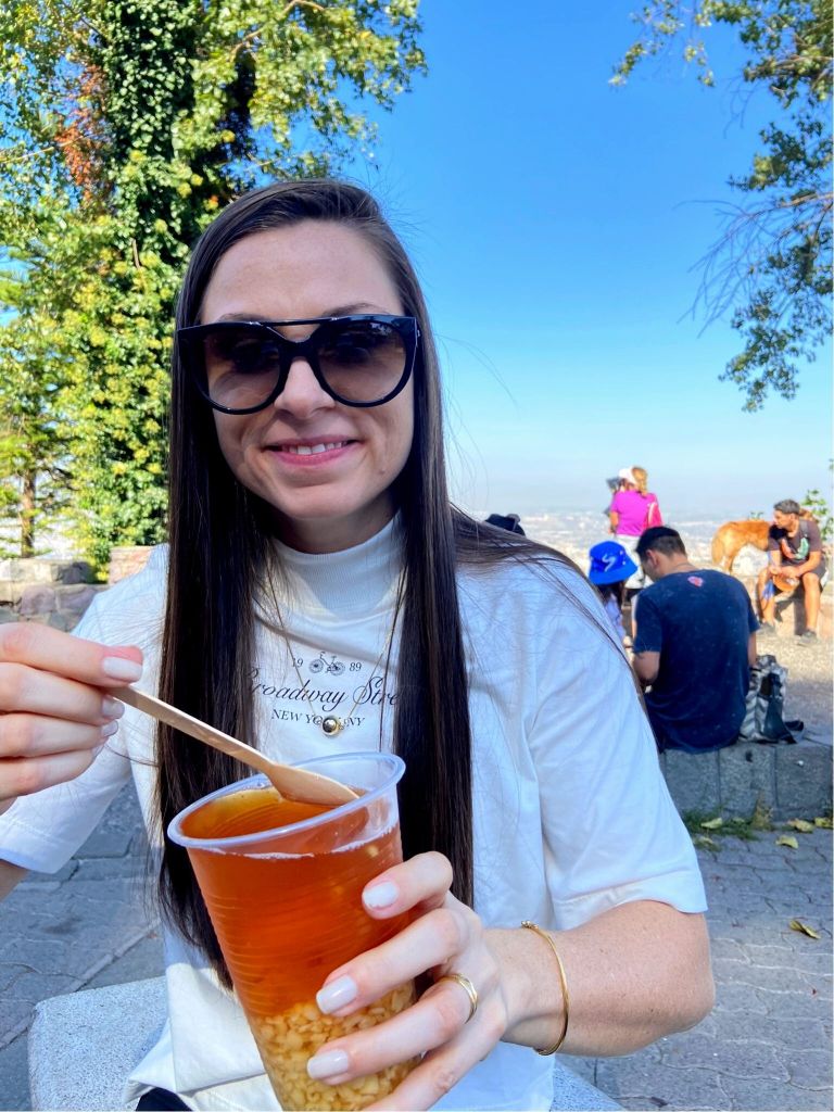 - No retorno ao teleférico pegamos de graça um sempre bem-vindo red bull. Na ida até o cume dá para perceber como algumas áreas de Santiago estão cheias de prédios e outras tem umas casinhas pequenas. Lá em cima, tomamos a bomba de açúcar chamada mote con huesillos, um tradicional, doce e revigorante refresco. Apreciamos mais um pouco a vista e descemos de funicular.