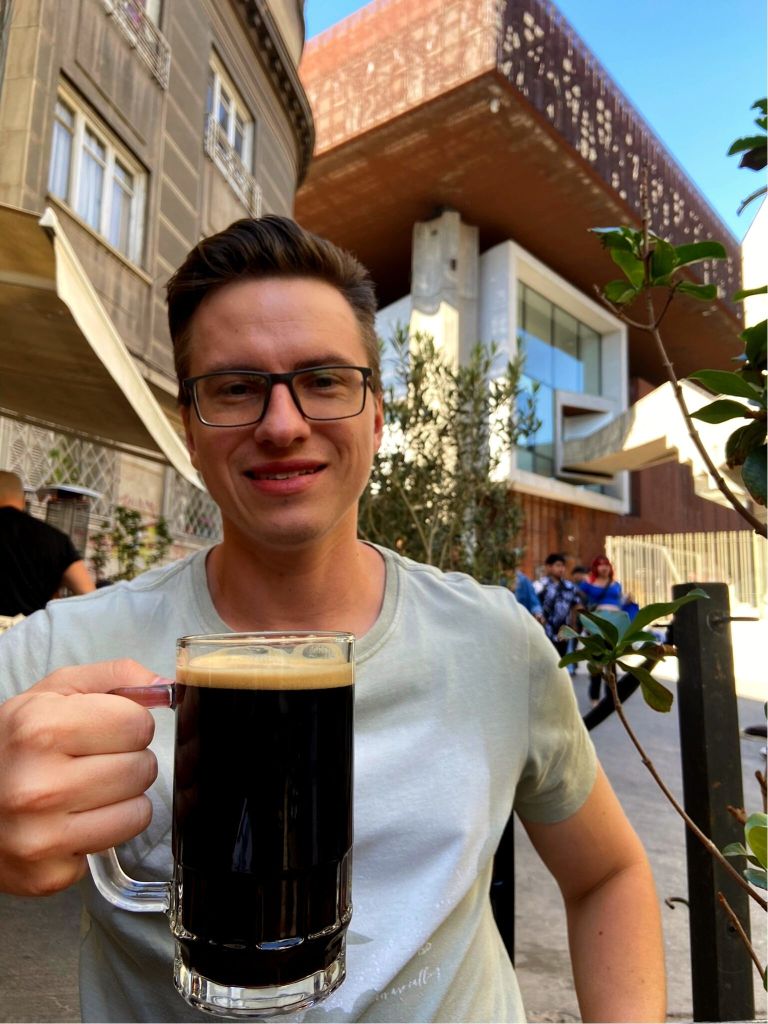 - Ficamos na dúvida se pegaríamos um uber ou iríamos a pé até o Luna Bar. Como o calor era forte tentamos o uber, mas não conseguimos nenhum carro. Cogitamos usar as patinetes disponíveis no bairro de Vitacura onde estávamos, mas não deu para liberá-las. Resolvemos andar e no caminho paramos em um café estiloso cujo dono é fã de jazz. A coleção de discos era até melhor que o café propriamente dito.