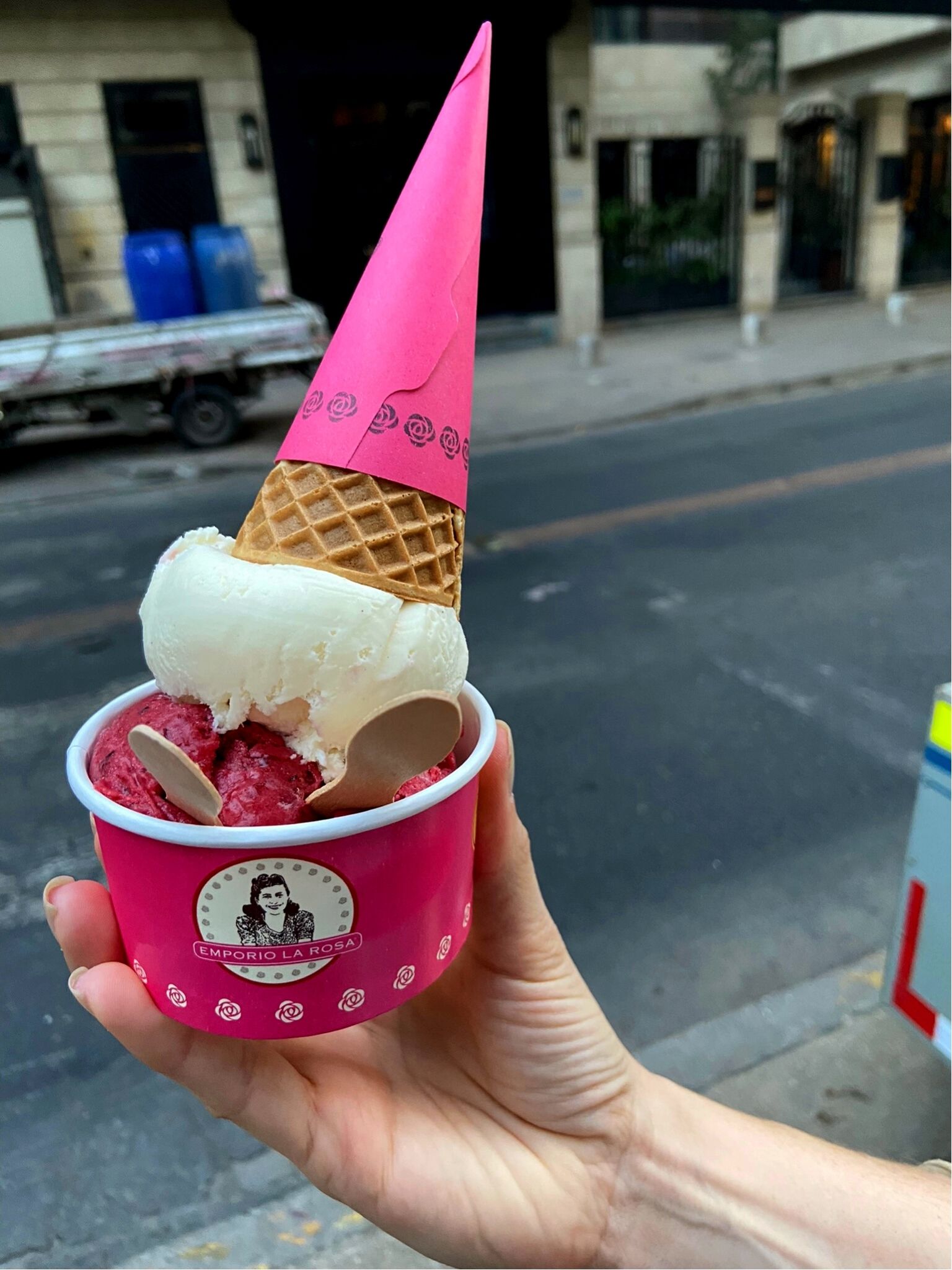 - O almoço/lanche foi no já clássico Empório La Rosa, do lado do hotel. Não hesitei e também peguei duas bolas de sorvete de sobremesa, a especialidade da casa. Fomos tomar no Parque Forestal, onde observamos cães passeando tranquilamente com seus donos.
