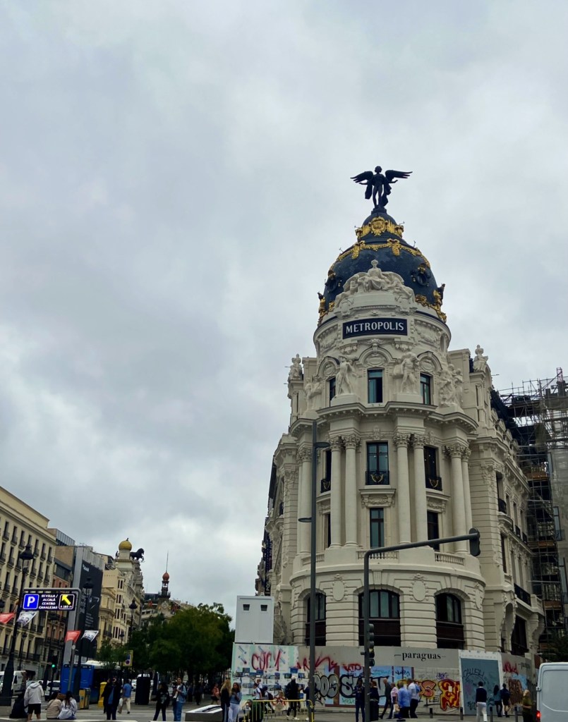 - Seguindo na região fomos até a Gran Via, a chamada Broadway de Madrid pelo grande número de peças e musicais que tem por ali. Vale a pena observar os tipos de arquitetura ao longo da via, basta parar, deixar a carteira em um local seguro e olhar para as belas fachadas. O número de lojas é absurdo, assim como a quantidade de caminhantes. Inclusive, foi em alguma quadra dessa rua que tive a certeza que o meu vans cumpre apenas o papel estético e não é adequado para longas andanças. Entrei em uma loja para cogitando comprar um tênis esportivo, mas o preço me assustou e resolvi aguentar bravamente as dores no pés.