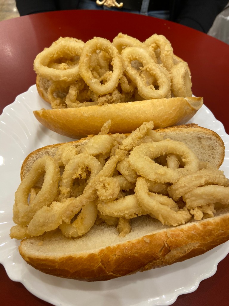 - Entre o deslocamento do Palacio Real até o Templo de Debod experimentamos o tradicional bocadillo de calamares. É simplesmente um pão recheado de lula a milanesa, mas foi a melhor lula que comi. Com um molho de alho por cima então o negócio fica top demais.