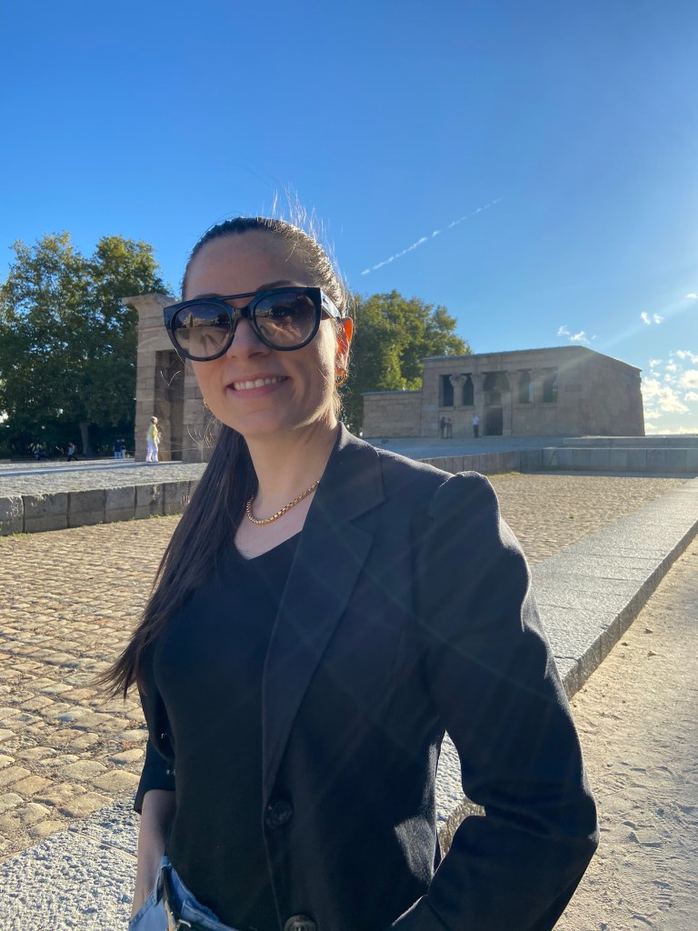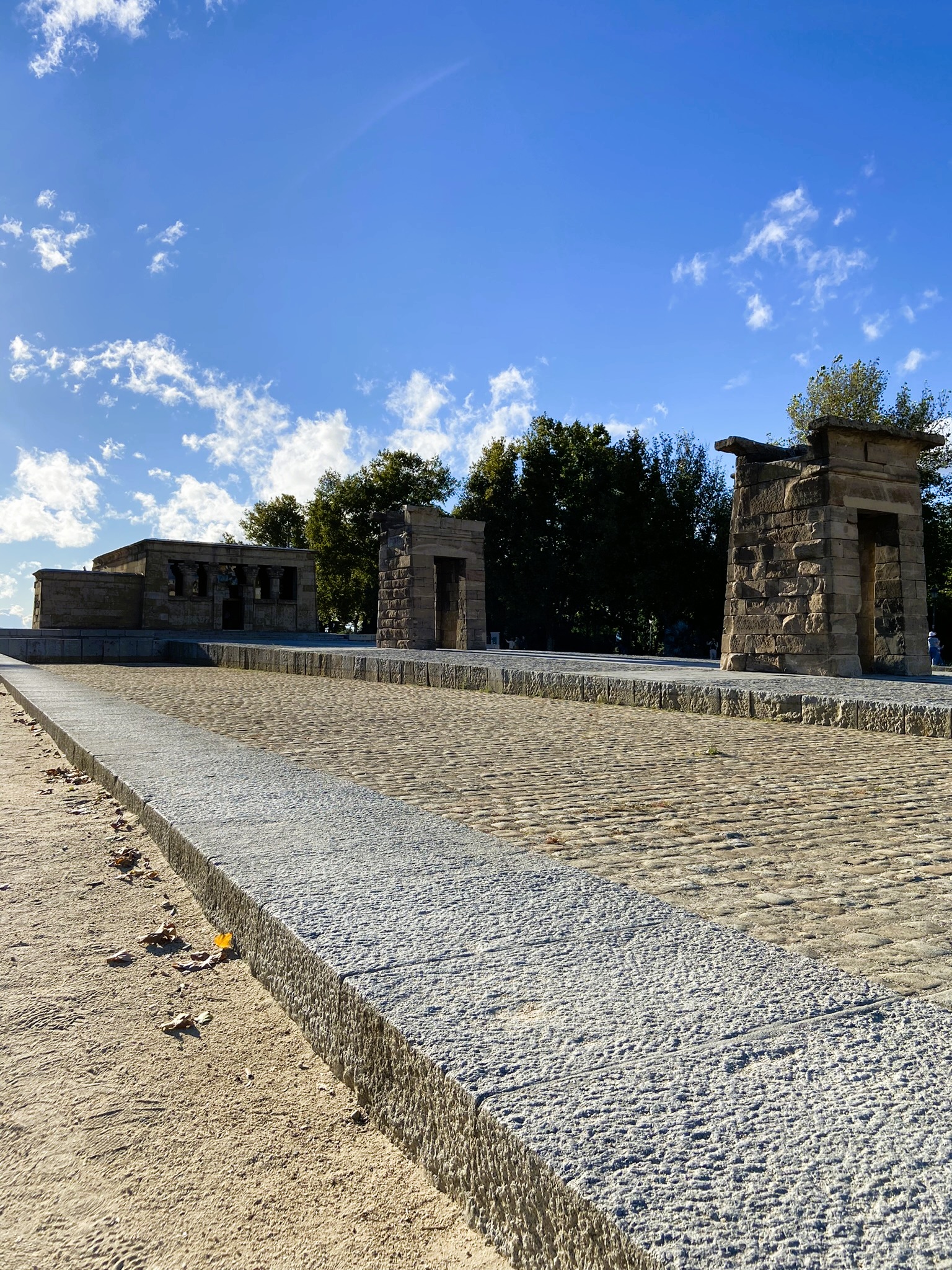 - Depois de alguns milhares de passos chegamos no Templo de Debod, uma construção de mais de 2 mil anos que o Egito deu de presente para a Espanha por essa ter oferecido ajuda após a inundação de um sítio arqueológico. Esse templo está em um parque grande e alto que é agradável e tem uma bela vista para o Palacio Real. Relaxante e belo. Pena que quando fomos não tinha água no mini lago em volta dele.