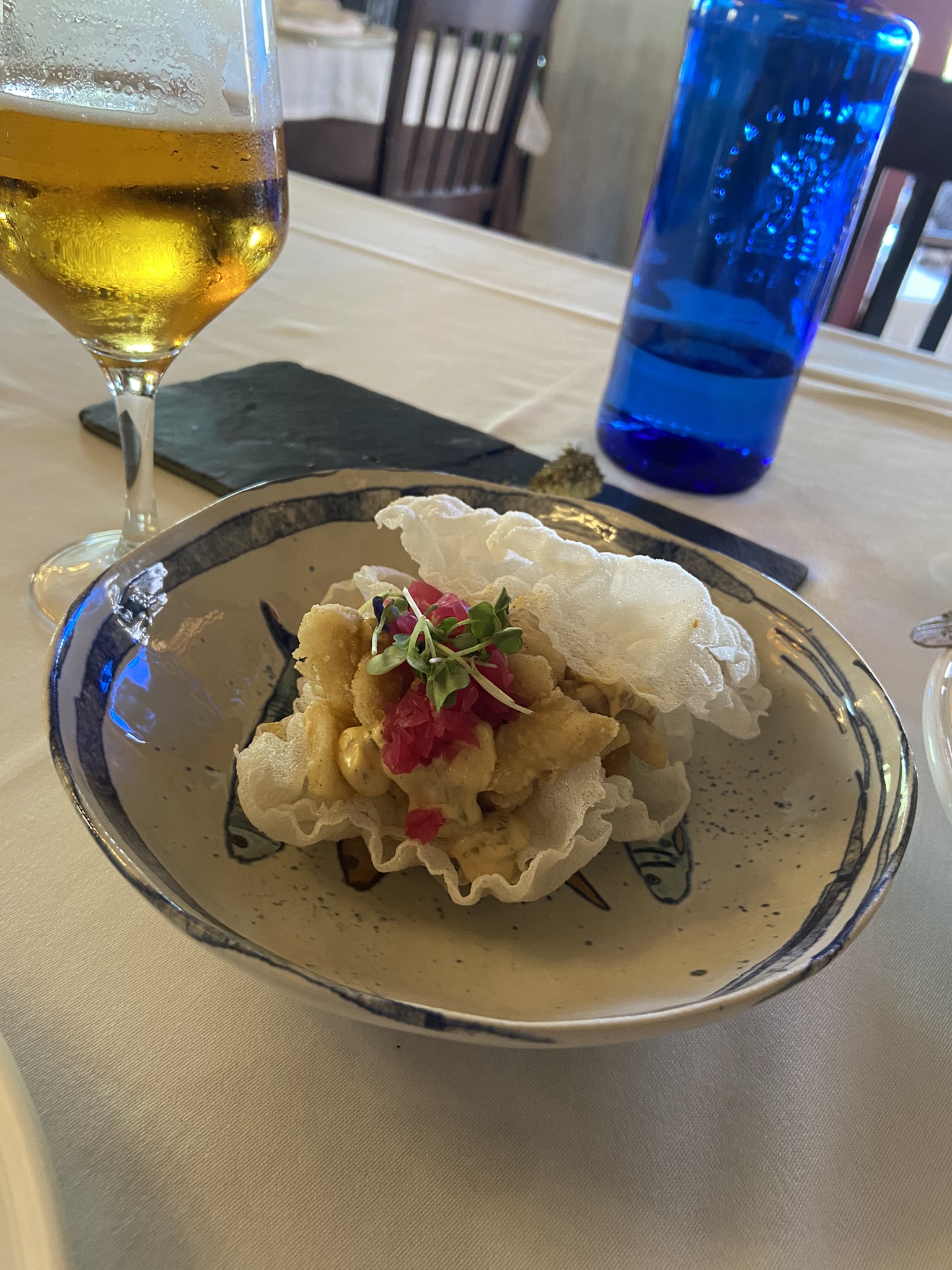- À noite descobrimos que para jantar com tranquilidade era preciso reservar algum restaurante previamente. Procuramos bastante e encontramos um com lugares disponíveis. Não era aquela maravilha, mas a senhorinha dona era simpática e foi onde experimentamos os primeiros tapas. Se não me engano, fomos de alcachofra e bacalhau.