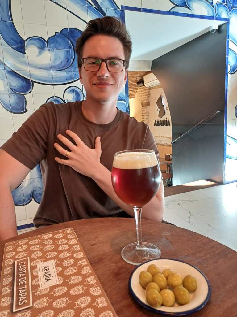 - Rapidamente decidimos voltar ao casco histórico e escolhemos uma cervejaria artesanal para tomar alguns pints. Escolhemos a La Abadia e foi só sucesso. Uma cerveja melhor do que a outra para matar o tempo. Detalhe para o banheiro curioso e insano do lugar, uma pegada futurista e quase surrealista. Uma verdadeira obra de arte da engenharia toledana, eu diria.