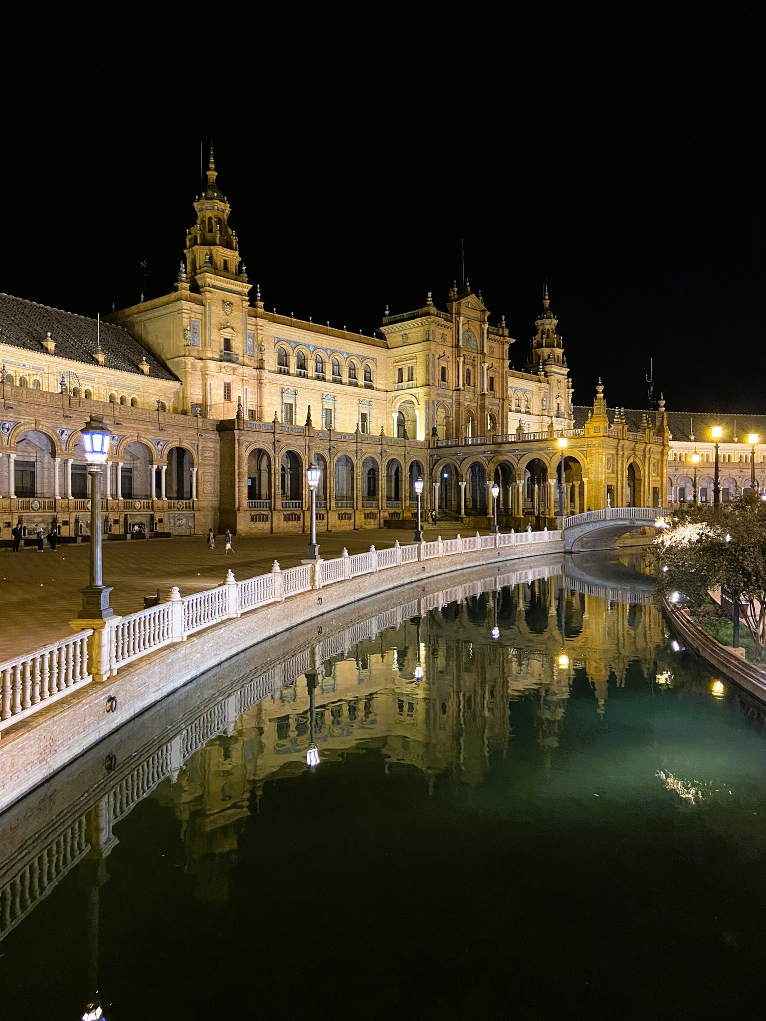 - E aí veio a cereja do bolo. Estava cedo para encerrarmos o dia e decidimos ir até a Plaza da Espanã, um lugar que te conquista na primeira olhadela. Ela é enorme e possui diversos detalhes que merecem ser contemplados por um bom tempo, mesmo à noite. Chama a atenção os azulejos com desenhos que representam todas as regiões da Espanha, o lago artificial, as torres e o edifício principal, as pequenas mas estéticas pontes e a possibilidade de observar tudo de diversos ângulos e altura. Claro que não perdi a oportunidade de encontrar exatamente o lugar onde uma cena de Star Wars – O Ataque dos Clones foi filmada.