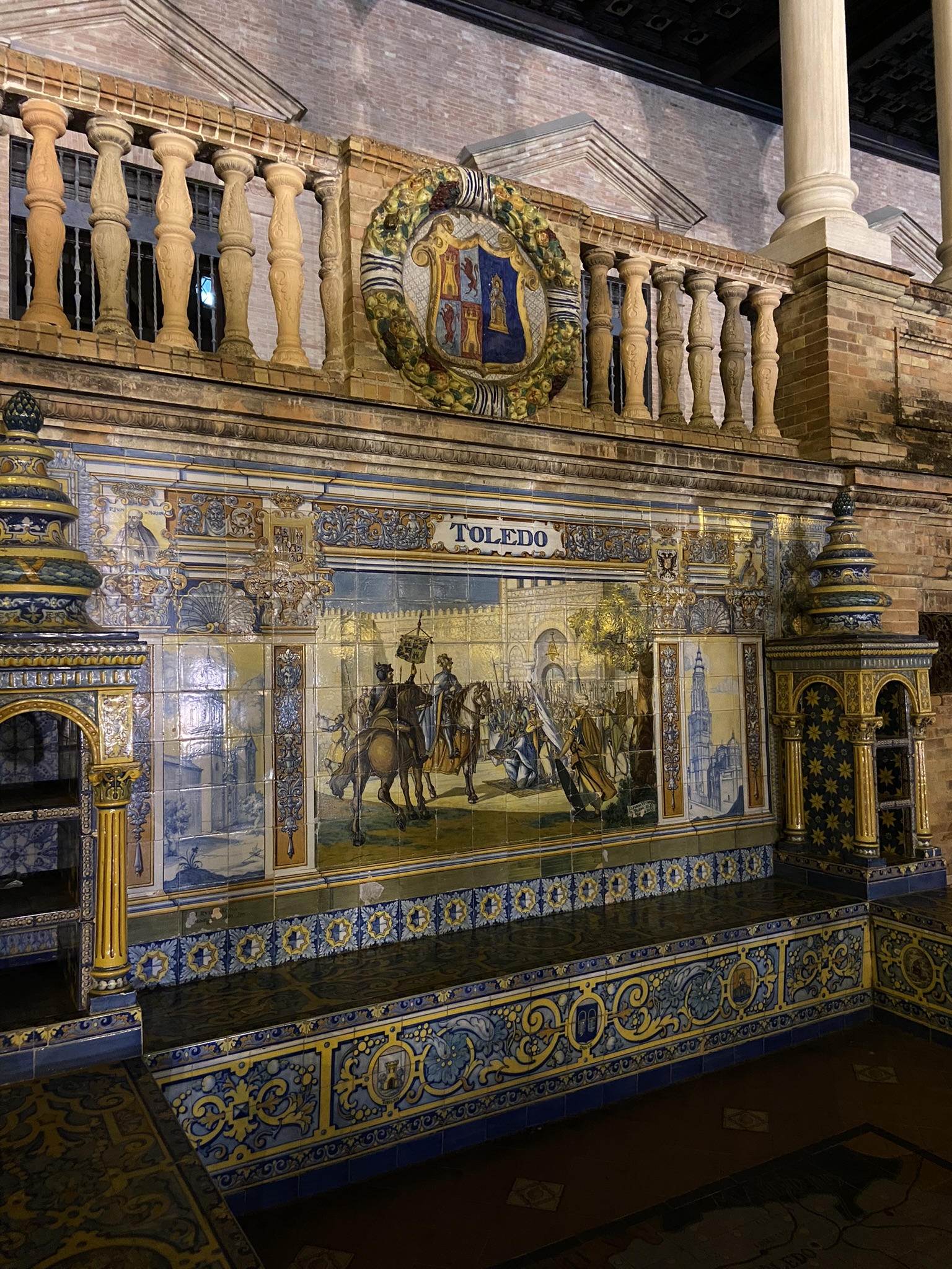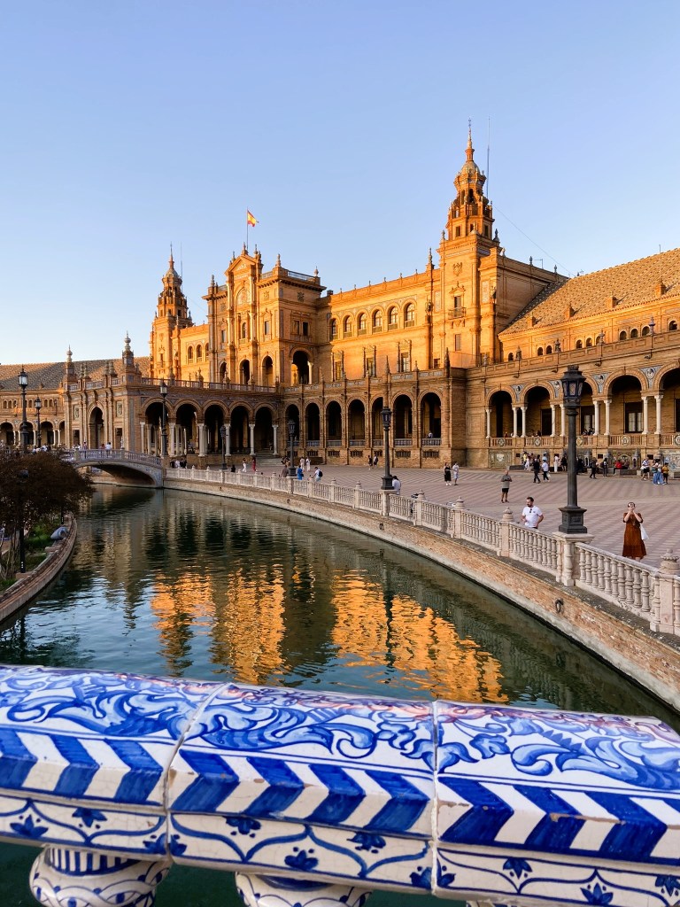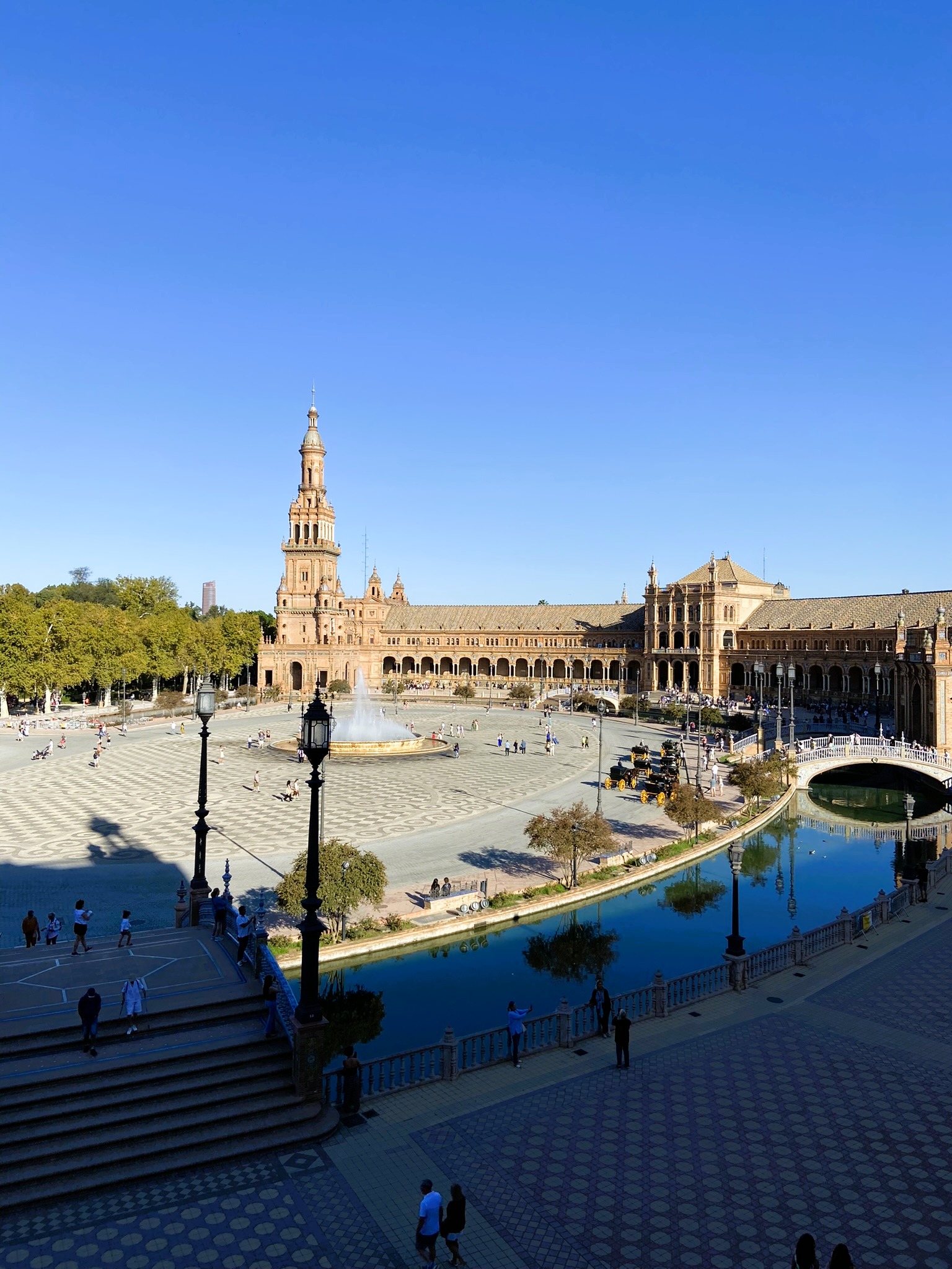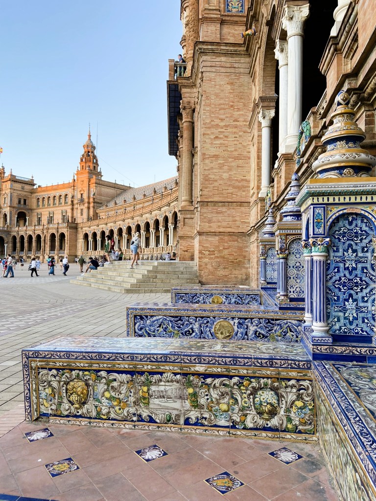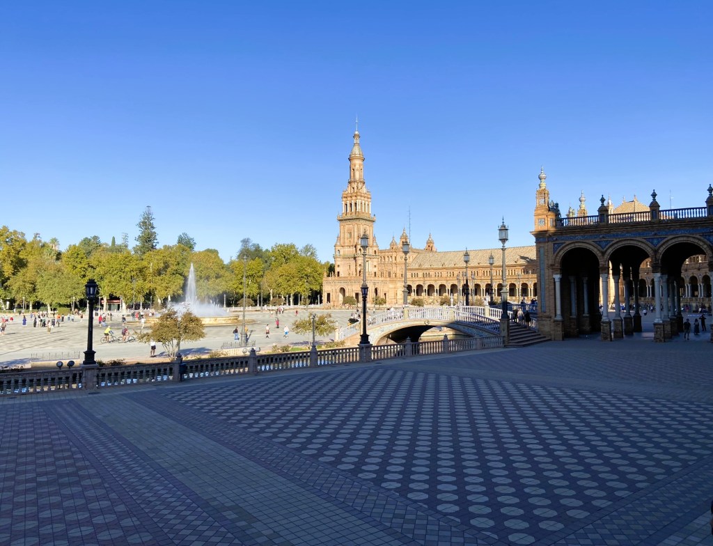 - Começamos o itinerário na fantástica Plaza de España para podermos vê-la iluminada pela luz do sol e a experiência foi incrível. Pudemos contemplar belos detalhes que passaram despercebidos na noite anterior. Só reforçou nosso sentimento de que esse é um dos lugares mais espetaculares que já visitamos.