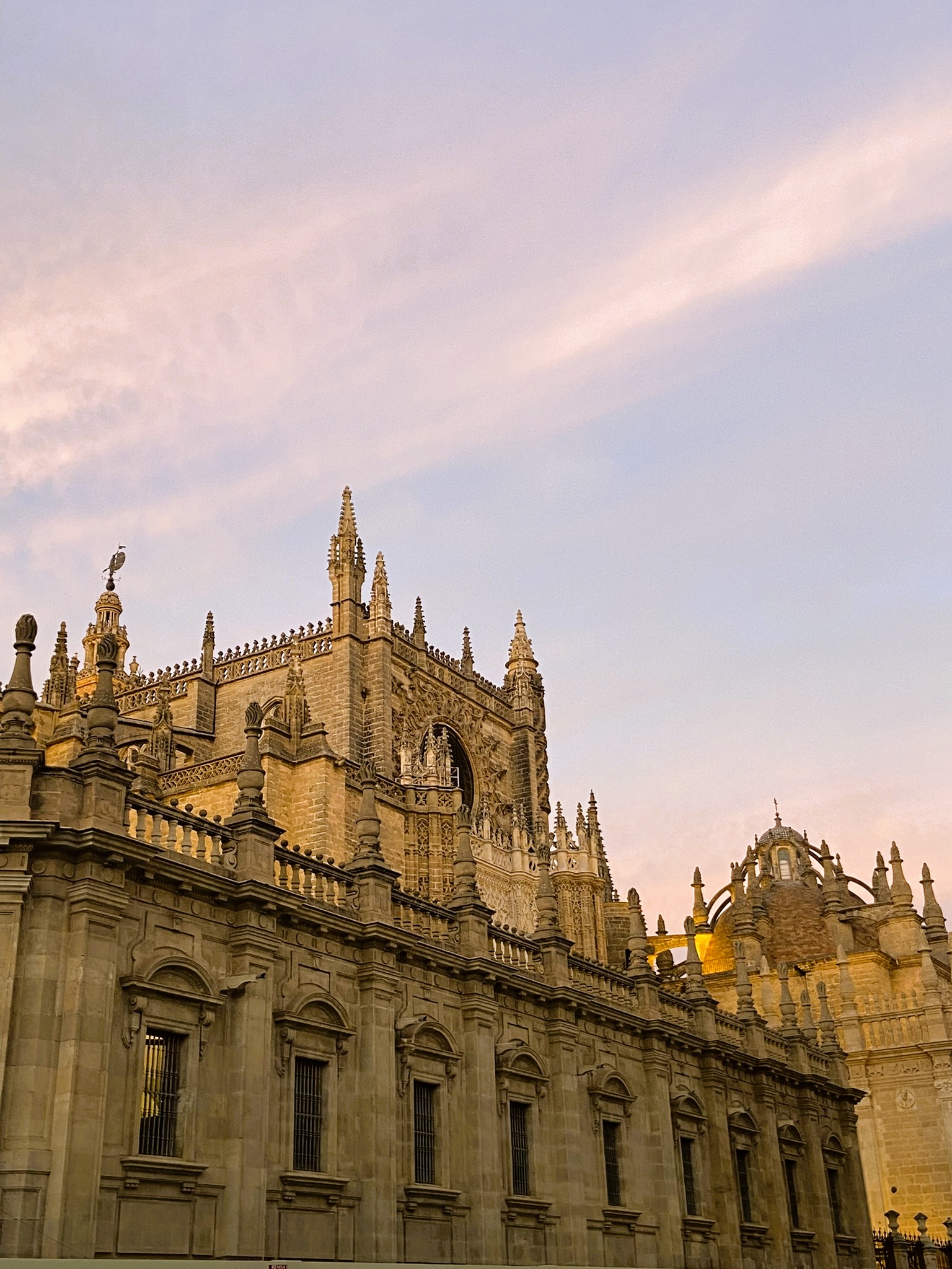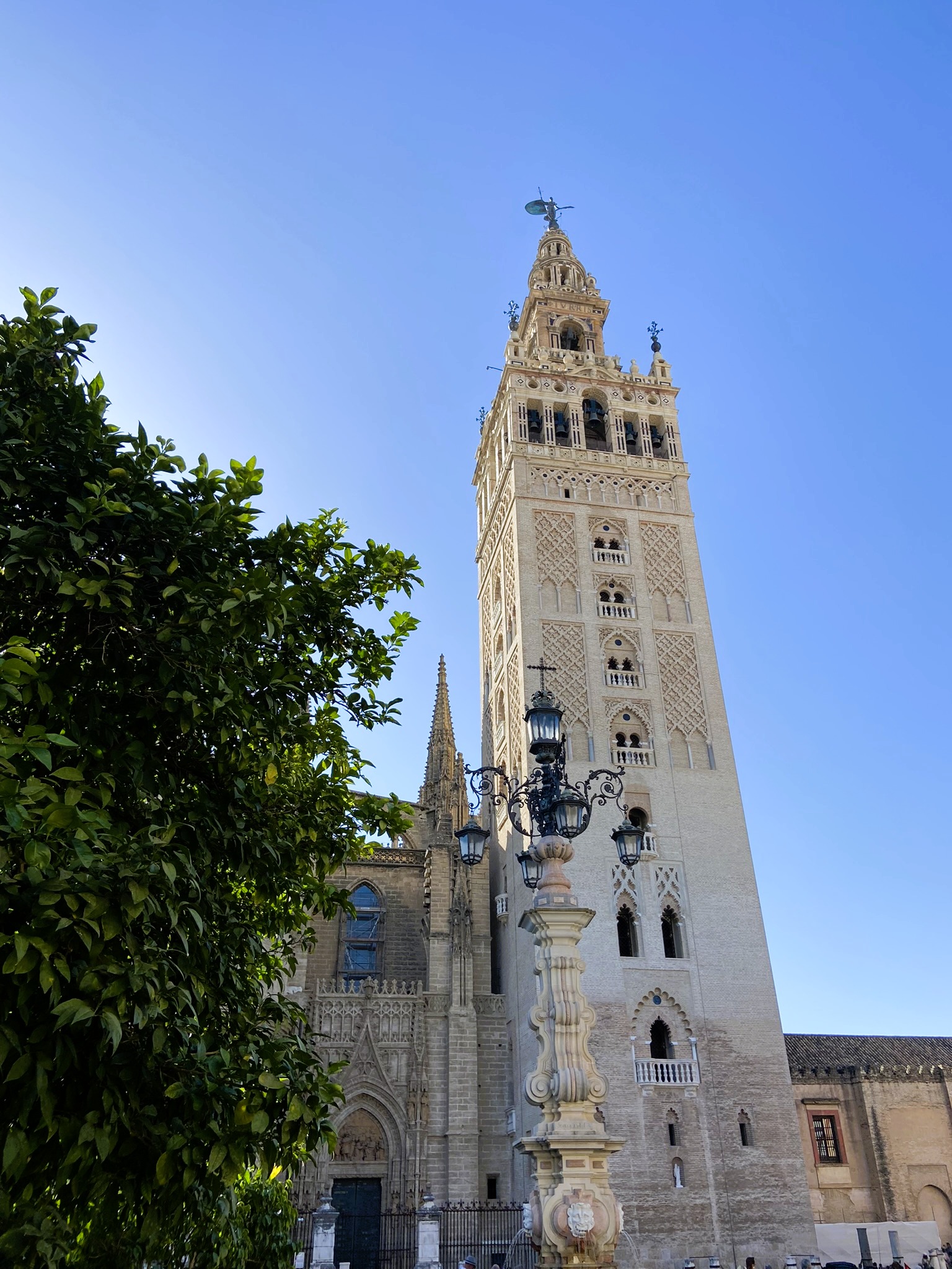 - À tarde enfrentamos o calor e andamos por vários dos pontos turísticos mais importantes da parte histórica. Passamos pelo parque Maria Luisa, espiamos o Alcazar e ficamos um tempo admirando a Catedral de Sevilla com seu estilo gótico e a enorme torre chamada La Giralda, com seus 94 metros. Queríamos visitar o Archivo General de Indias, mas estava fechado.