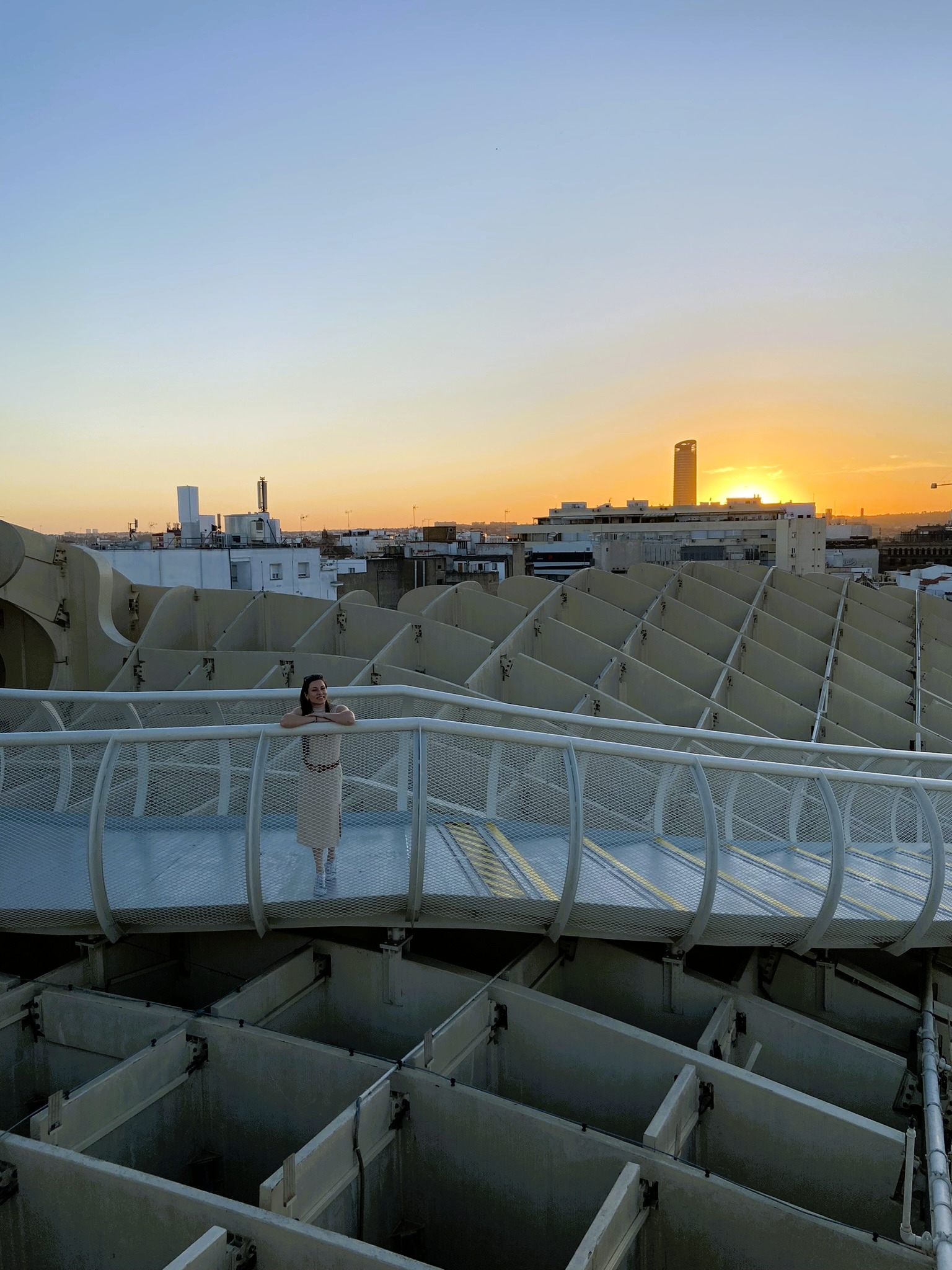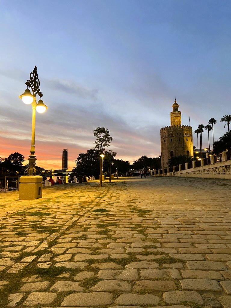 - Saindo do museu fomos espiar as Setas de Sevilla por fora e nos impressionamos com o tamanho dessa estrutura de madeira no meio da cidade. Resolvemos sentar em um restaurante e experimentar a sangria. Na sequência, o calor já estava mais tolerável e andamos até o rio Guadalquivir e a Torre del Oro. Apesar do grande movimento por ali encontramos um lugarzinho próximo a beira do rio para apreciar um por do sol de um laranja exuberante.