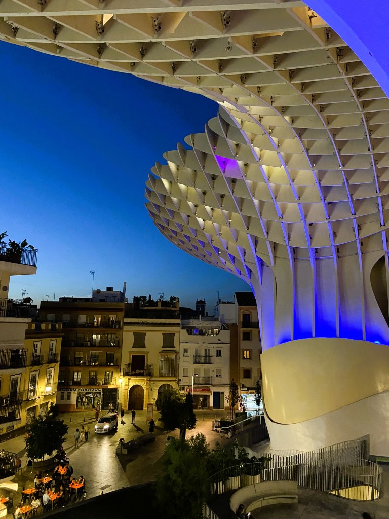 - As Setas (ou Metropol Parasol) são enormes estruturas de madeira no meio da cidade cujo formato se assemelha a cogumelos (se forçamos a imaginação…). Antes de passearmos nas Setas vimos um videozinho promocional com belas cenas da cidade.