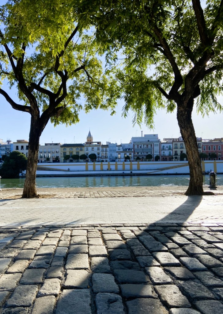 - Ficamos do lado de cá do rio em uma sombra tomando água e esperando o nosso horário para visitar as Setas de Sevilla.