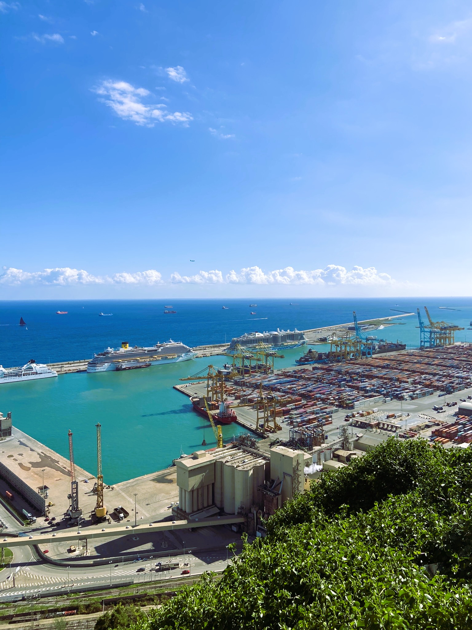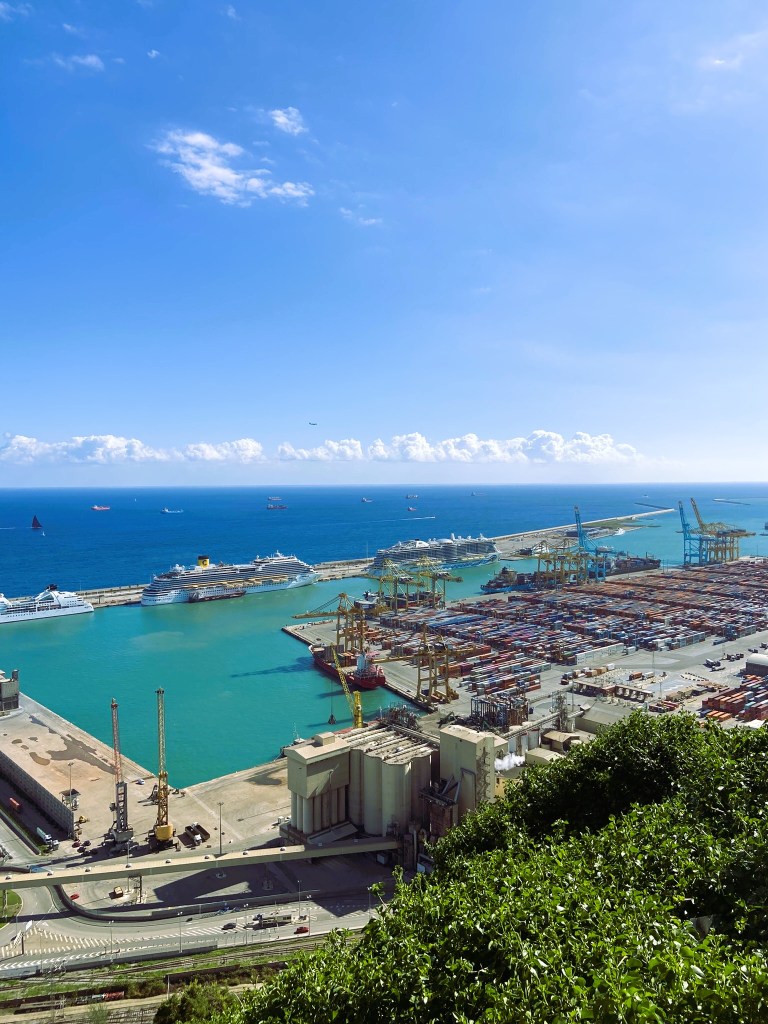 - O que foi legal foi contornar o castelo e ficar de frente com o Porto de barcelona, lá de cima. Caramba! Como é enorme e movimentado, com conteineres para todo o lado e cruzeiros gigantescos vindo de tudo que é canto. Ficamos um bom tempo ali observando e descansando.