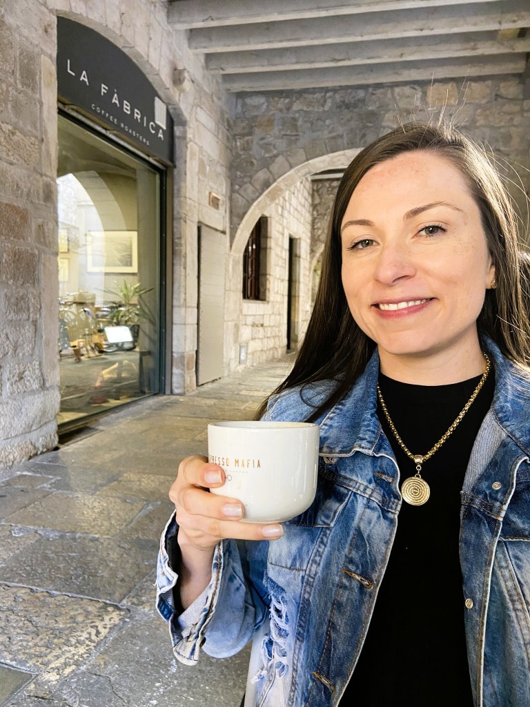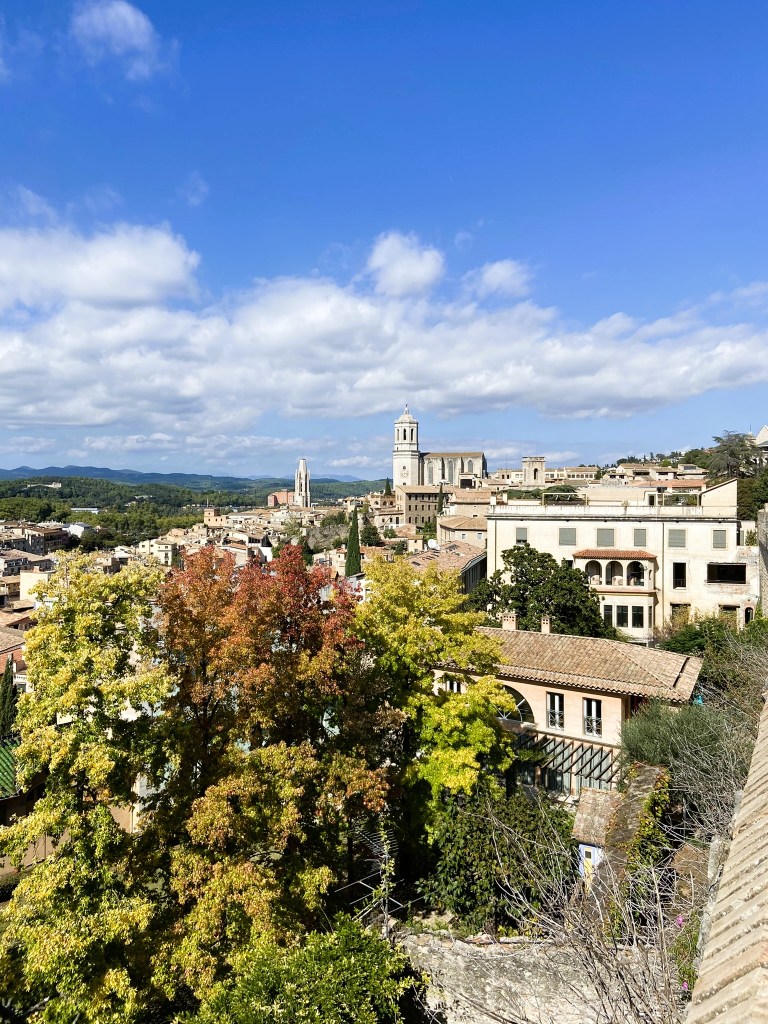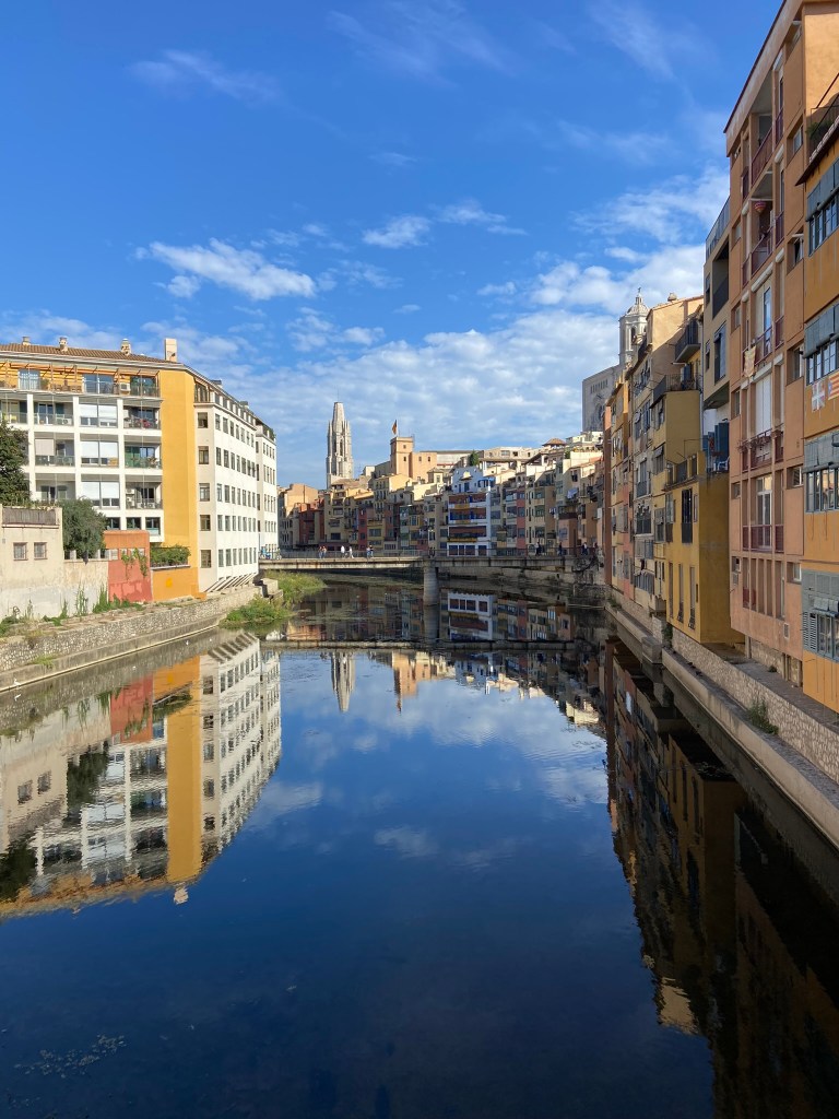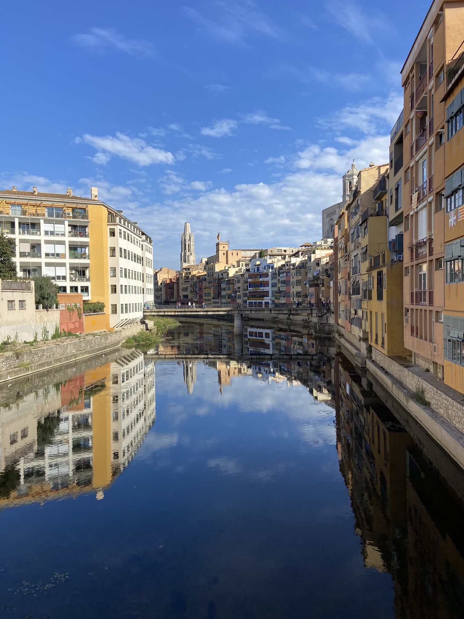 - Resolvemos ir cedo e o movimento ainda era pequeno. A cidade ainda estava acordando, sem muita pressa. A caminhada da estação de trem até a área turística é bem tranquila e rápida. As primeiras coisas que percebemos inicialmente foram as várias bandeiras catalãs e do time da cidade (que estava jogando a champions league naquela época) nas janelas e a paixão pelo ciclismo. Eu não sabia, mas Girona é um ponto de encontro de ciclistas por possuir inúmeras rotas em suas redondezas. Encontramos várias pessoas com suas bicicletas de milhares de euros, bem como lojas especializadas e cafés temáticos.