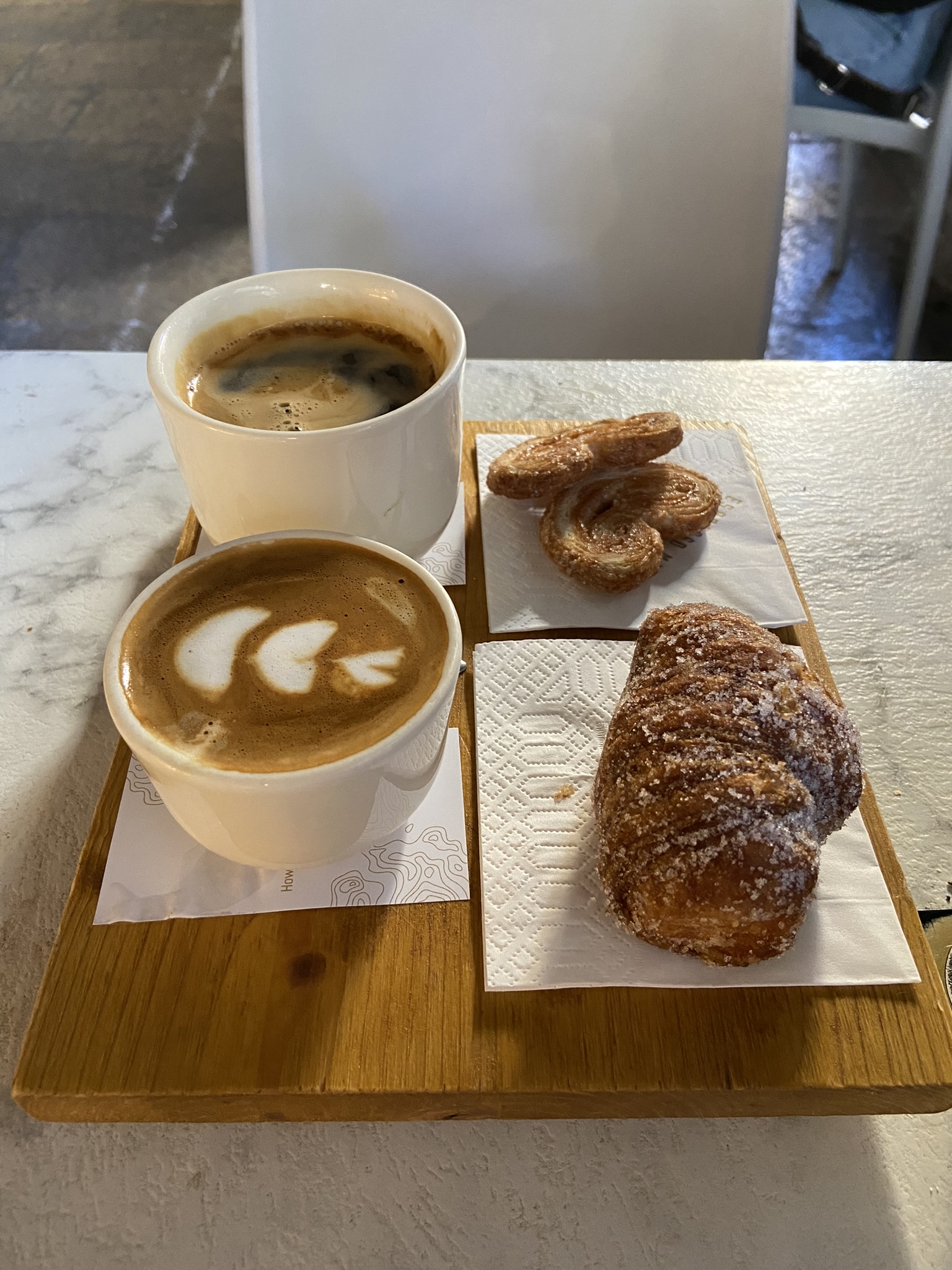 - A fome começava a bater e também a necessidade de repor a cafeína. Descobrimos o espetacular Espresso Mafia Coffe, que servia cafés de qualidade e o doce típico chamado xuixo. Eu diria que tudo que é frito costuma ser bom e o xuixo não foge disso.