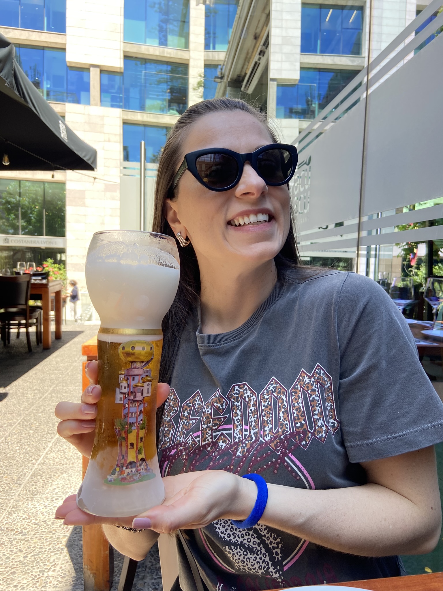 - E pela primeira vez em nossas idas a Santiago resolvemos ver a cidade do alto do Sky Costanera. Com um elevador que mais parecia um foguete chegamos no andar 61 e depois pegamos uma escada rolante até a área que oferece uma vista de 360 graus. Achei divertido ver Santiago lá de cima, ainda que nesse dia os Andes não estivessem com quase nada de neve. Mas o bom é que o céu estava limpo e deu para observar o San Cristobal, o rio mapocho, a pré cordilheira, o túnel que leva ao Ciudad Empresarial, o parque bicentenário, o estádio nacional e mais! Consegui até ver o terraço do nosso hotel com sua convidativa piscina. Tentamos e não conseguimos ver o Cerro Santa Lucia. Experiência um tanto cara, mas para quem gosta de ver cidades de cima é uma oportunidade interessante.