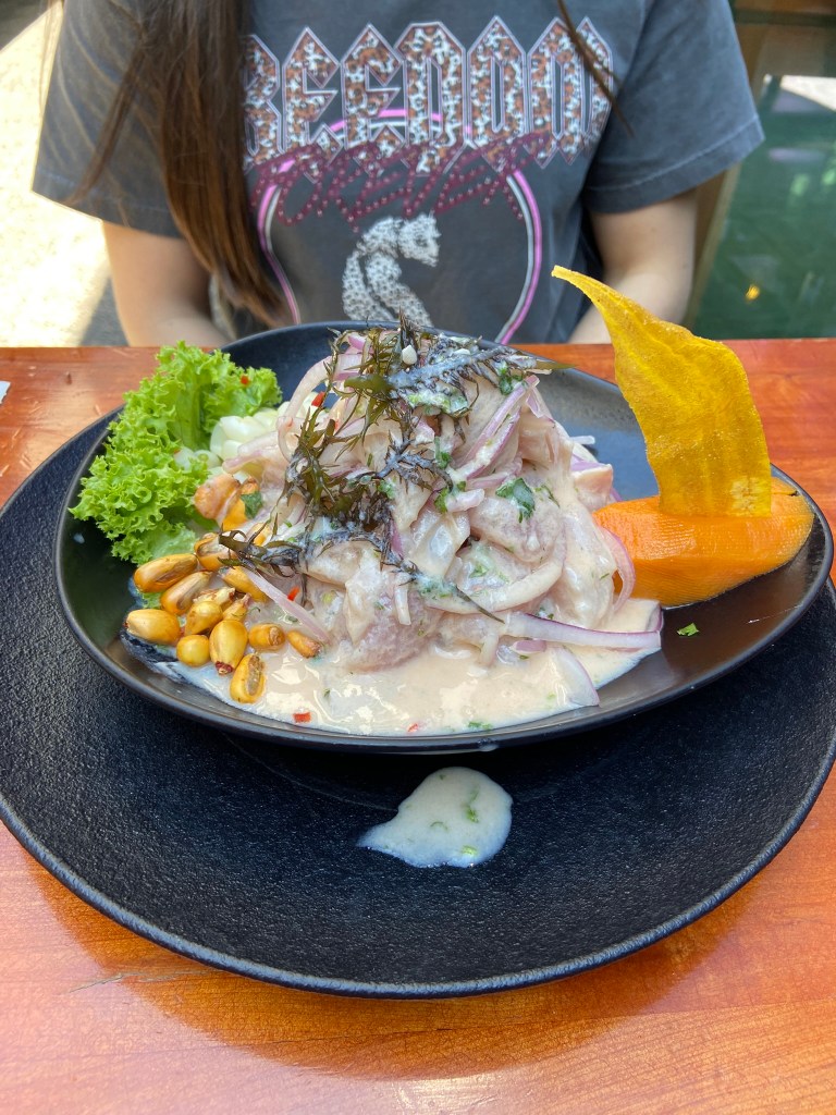 - Hora de almoçar e fomos a pé até o peruano Tacu Tacu. Nominho intrigante, não é mesmo? Pois é. O tal tacu tacu é o carro chefe do restaurante e é um prato típico da culinária peruana. Basicamente, é uma mistureba de arroz e feijão branco que é frita na frigideira. Vira um bolinho consistente e saboroso, ainda mais acompanhado com o clássico lomo saltado. Mandamos também um fantástico ceviche e com direito a duas cusqueñas trincando. O esquenta apropriado para um festival do outro lado dos andes, eu diria.