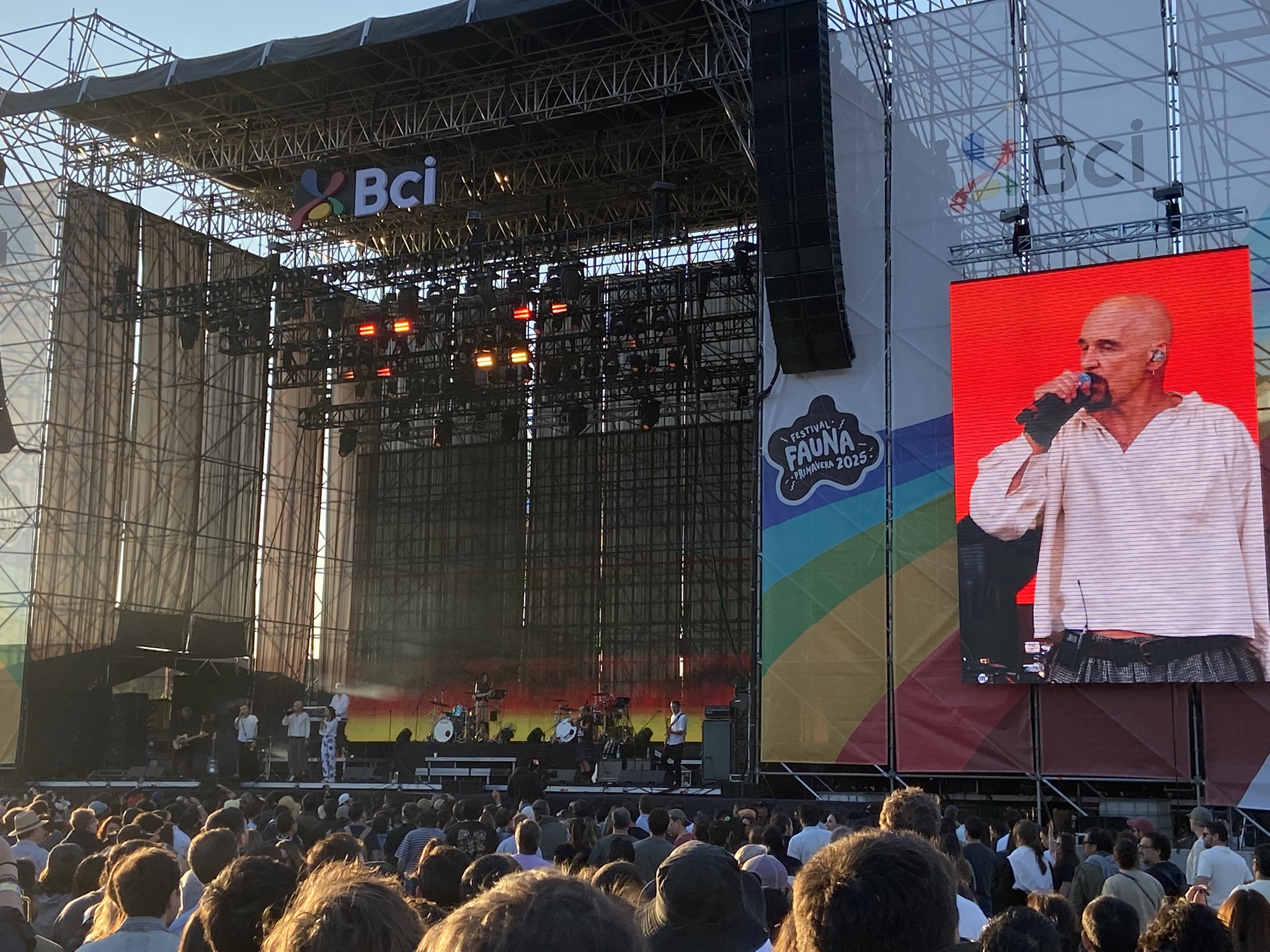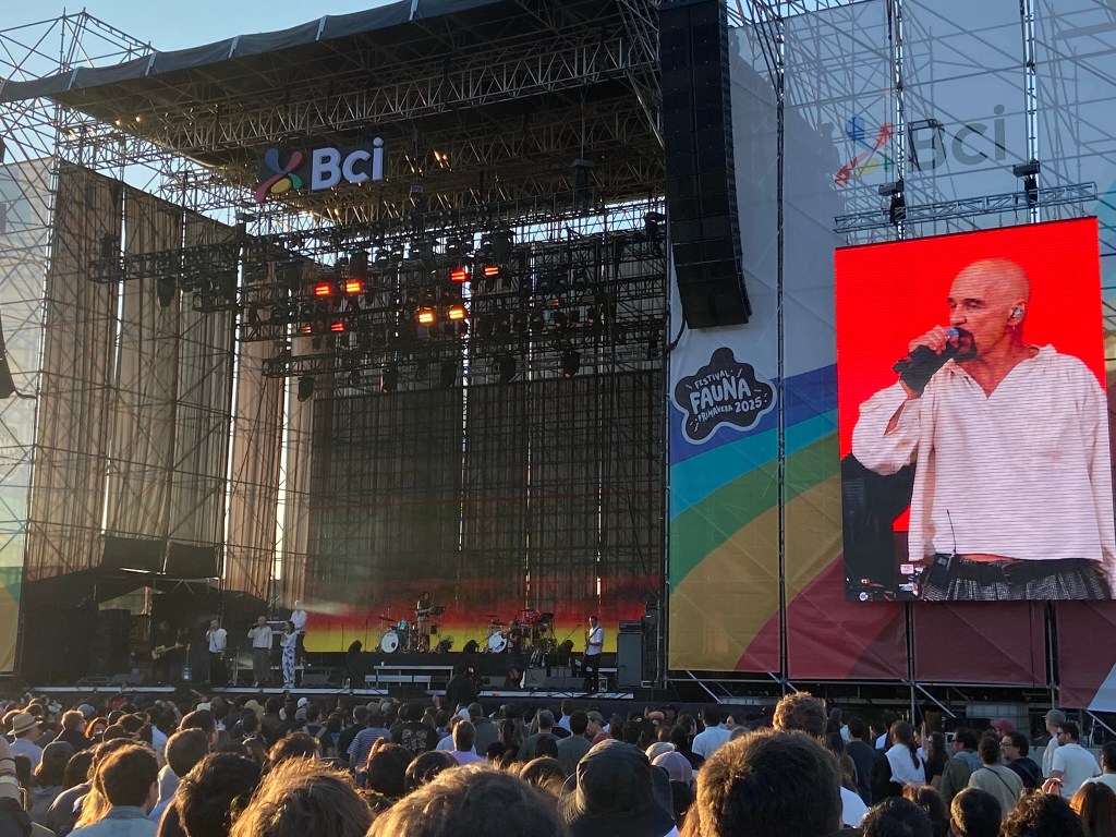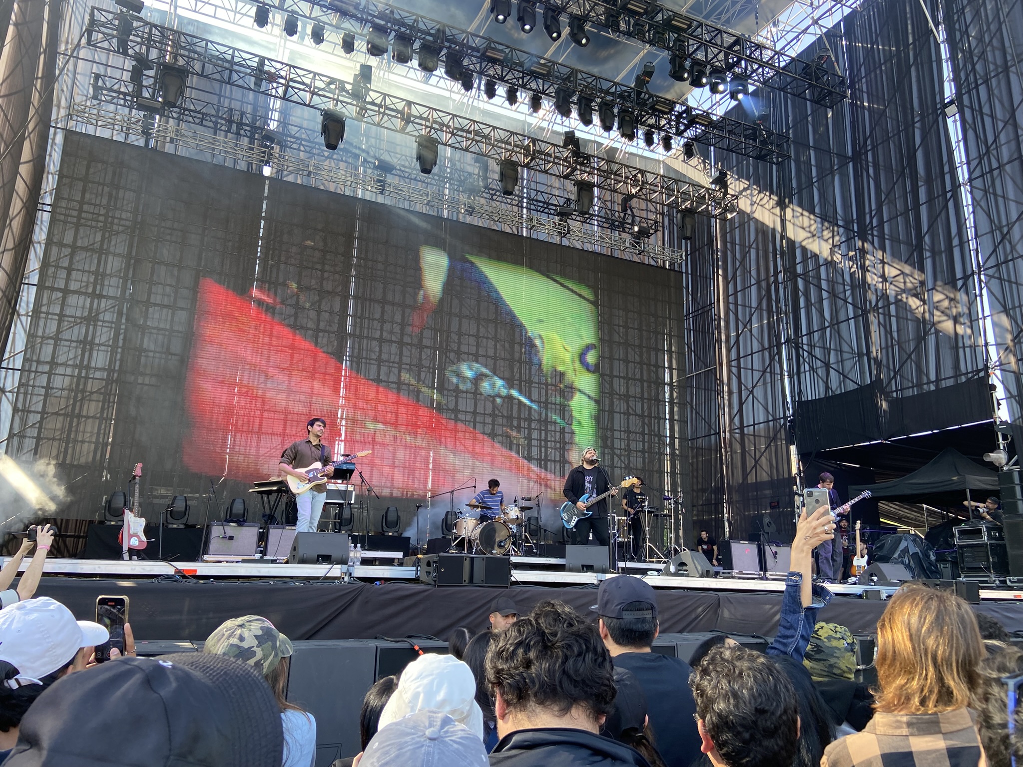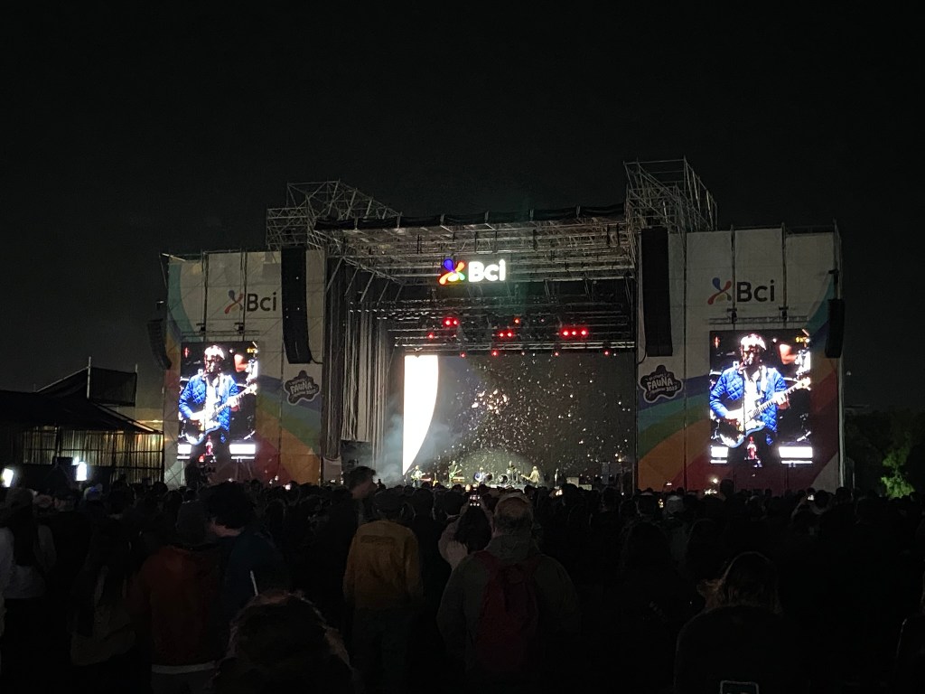 - Após conseguirmos entrar fomos rapidinho para o palco e vimos umas 5 músicas e começar a me arrepender de ter ido de calça para lá. Tava quente. De qualquer forma, deu para ver que essa banda chilena tem uma boa quantidade de fãs. Eles podem ser classificados como um rock alternativo e cantam em espanhol. São bem sólidos ao vivo, escutamos com clareza o vocalista cantando e aproveitamos as ótimas Explorador e Loba Mayor. Cantamos junto os oooo de Los Ases Falsos e quase toda a cheia de sensibilidade 2022. Foi legal também ver a estrela pop chilena Javiera Mena no palco cantando com eles o hit Otra Era.