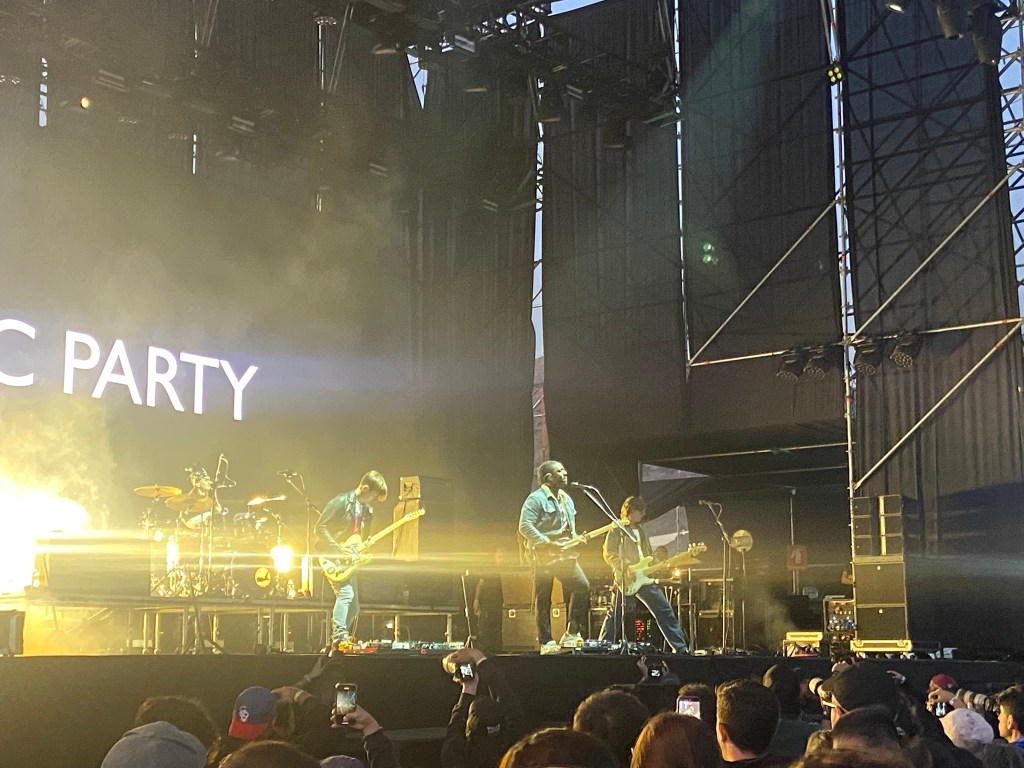 - Bueno. Mais leves e saltitantes fomos até o palco onde em uns 30 minutos o Bloc Party iria tocar. E deu para pegar um lugar mais na frente e no canto. Excelente posição. Eu estava um tanto receoso em relação a esse show, pois lembro-me que antigamente a banda sofria um tanto em performances ao vivo. Não dessa vez. No primeiro show da história deles no Chile Kele Okereke e companhia entregaram tudo e mais um pouco. Essa turnê é para marcar os 20 anos do maravilhoso álbum de estreia Silent Alarm, mas claro que rolam outros sucessos. Olha, eles destruíram! Inicialmente a voz do Kele parecia meio baixa, mas depois ele foi se soltando e as coisas ficaram cada vez melhores. Teve baladas cantadas com emoção pelo público como Modern Love e Blue, clássicas como Banquet e Helicopter, momentos mais dançantes com Flux e The Love Within e bangers que fizeram o povo sair do chão como Traps e principalmente Ratchet que encerrou a experiência lá em cima. Um show intenso, que mescla um tom de urgencia de pedradas com uma melancolia doce nas baladas. Kele não é de falar tanto, só o necessário, mas ele tem bastante presença física… claro, ajuda o fato do cara estar um monstro, mas ele tem um gingado responsa também. O cenário minimalista com o letreiro dizendo Bloc Party, um jogo de luzes apropriado, a noite santiaguina e fãs que há muito queriam vê-los ao vivo fizeram desse show o meu preferido do Fauna Primavera. E top 3 do ano.